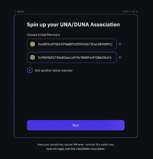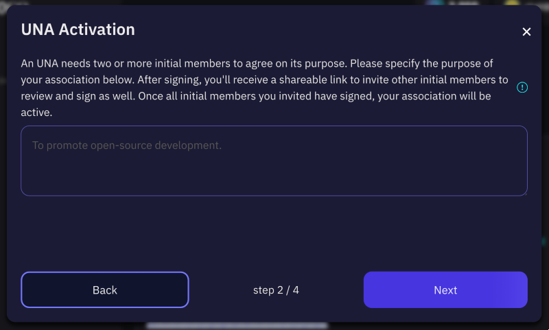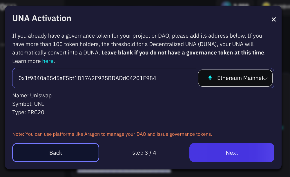 - Purpose and Governance: Define your UNA’s purpose and, if applicable, add a governance token (ERC20, ERC721, ERC1155, with more formats coming).