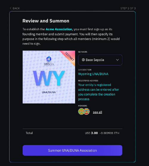 The absence of formal registration to summon an UNA under the laws of Wyoming, combined with legal wording in OtoCo’s UNA agreement that automatically converts an onchain UNA into a DUNA once the association grows beyond 100 members, allowed OtoCo to fully smart-contractify the creation of an UNA and its transformation into a DUNA, and make this process instant and low cost.
