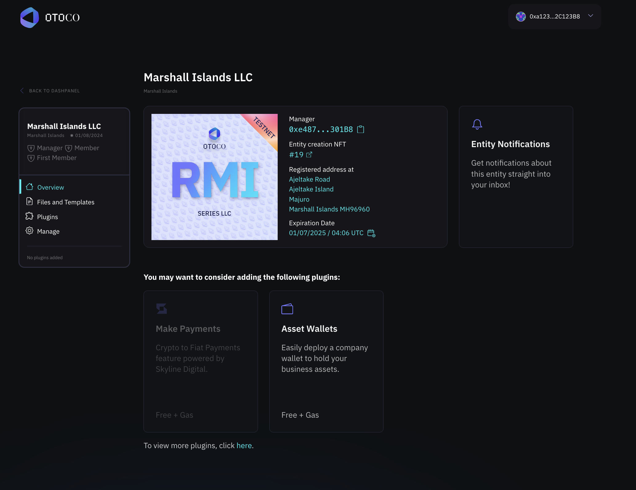 - Entity management from the comfort of your wallet: OtoCo lets users manage their entire entity from within the OtoCo dashboard by simply connecting with their Member wallet. From renewals to add-ons such as asset wallets in the name of their LLC, to ultimately folding up their entity, every event is only a cryptographic signature away!