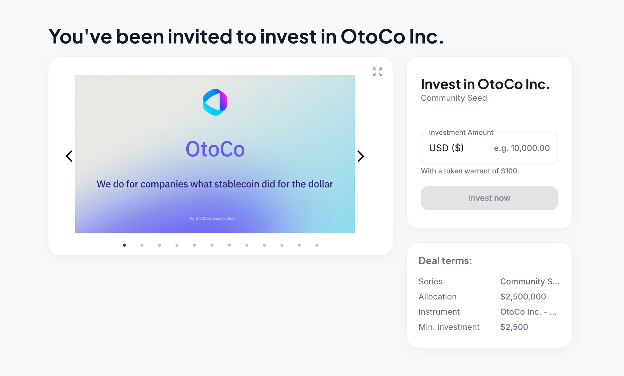Scroll down to learn more, view our deck, and invest in OtoCo — starting from just $2,500, in crypto or fiat.