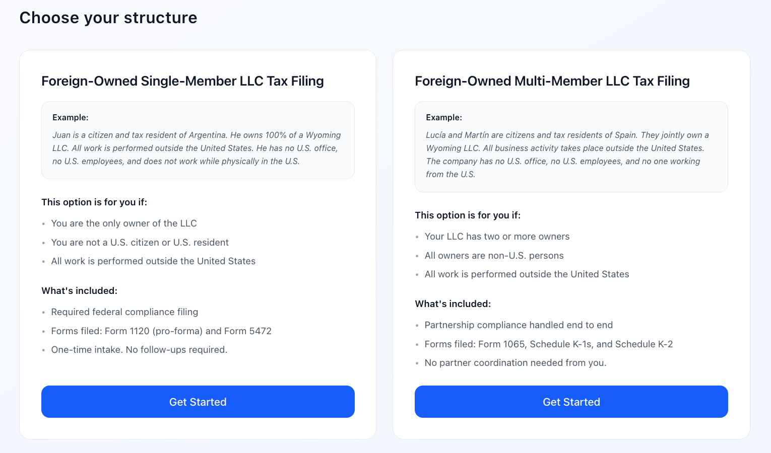 Foreign-Owned Multi-Member LLC Tax Filing: $899 per Tax Season - You'll then be prompted to answer a short set of questions.